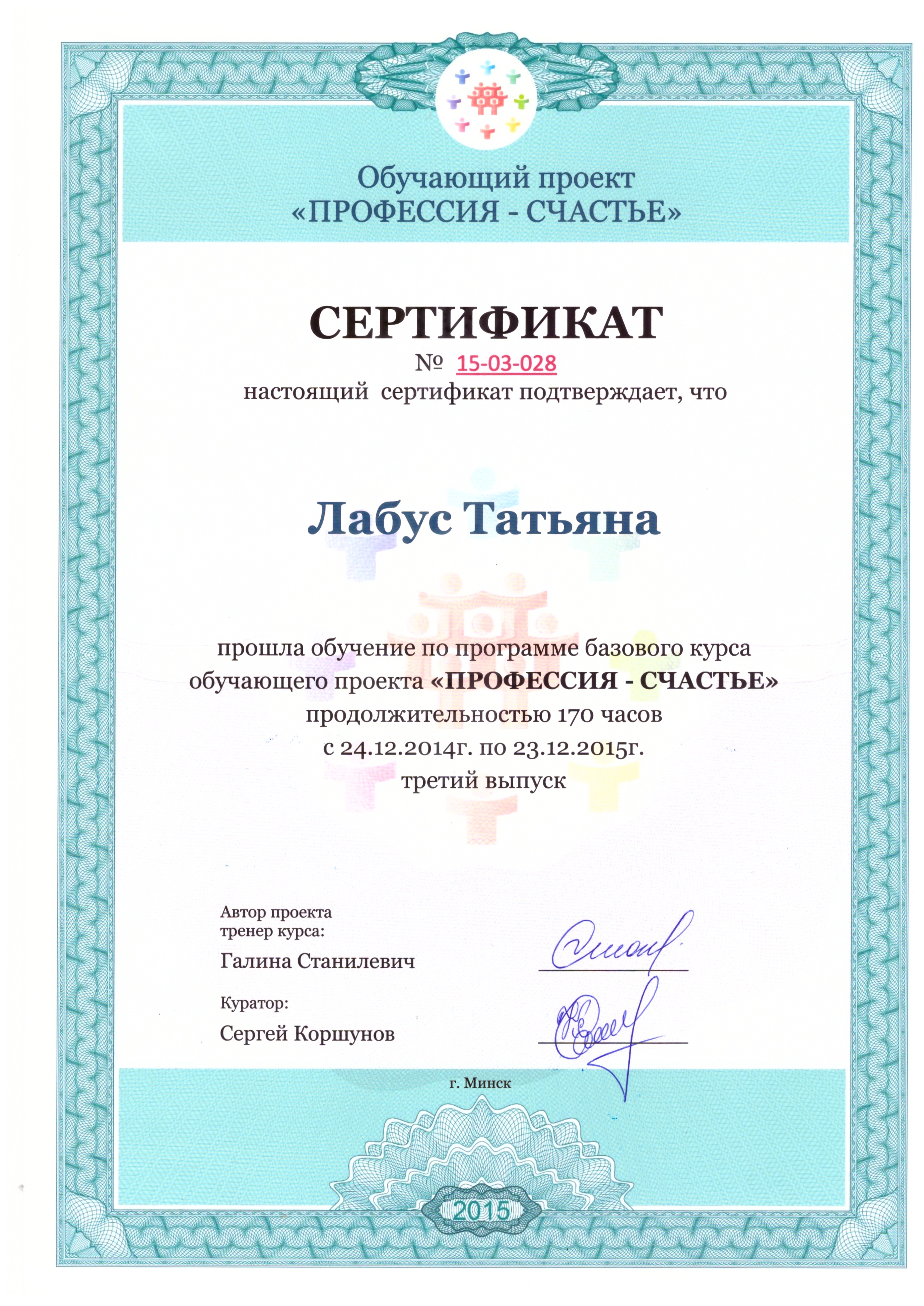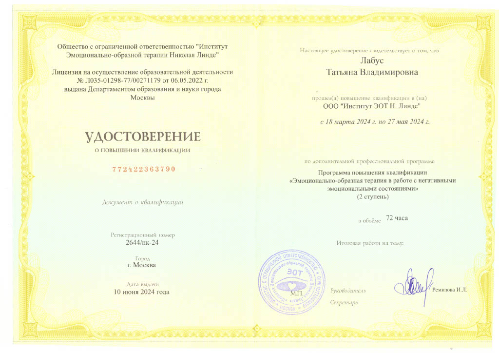 курса подготовки специалистов в практическом методе эмоционально-образной терапии (ЭОТ) в Институте Н. Линде в Москве.